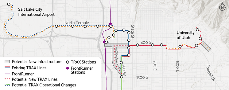Proposed Light Rail Improvements in the TechLink TRAX Study Include Enhancements to Existing Lines and a New Line From the Airport to the University of Utah Research Park
